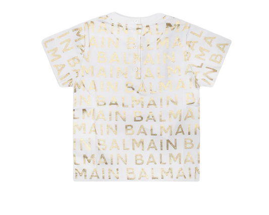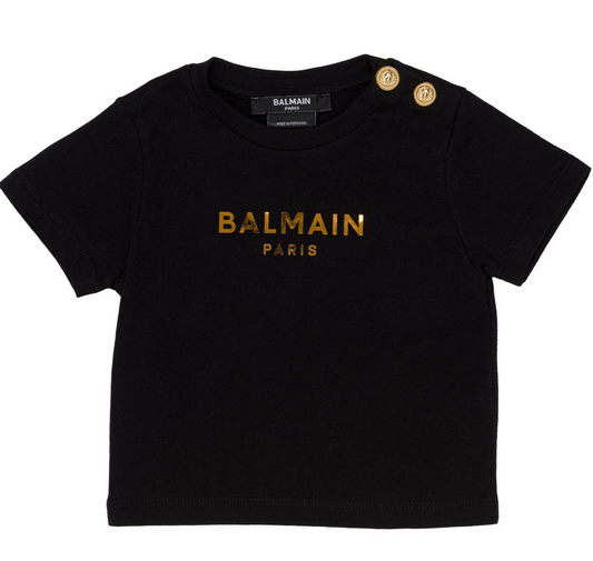 BALMAIN T SHIRT BABY SS GOLD LOGO TEE W BUTTONS BT8561 100OR